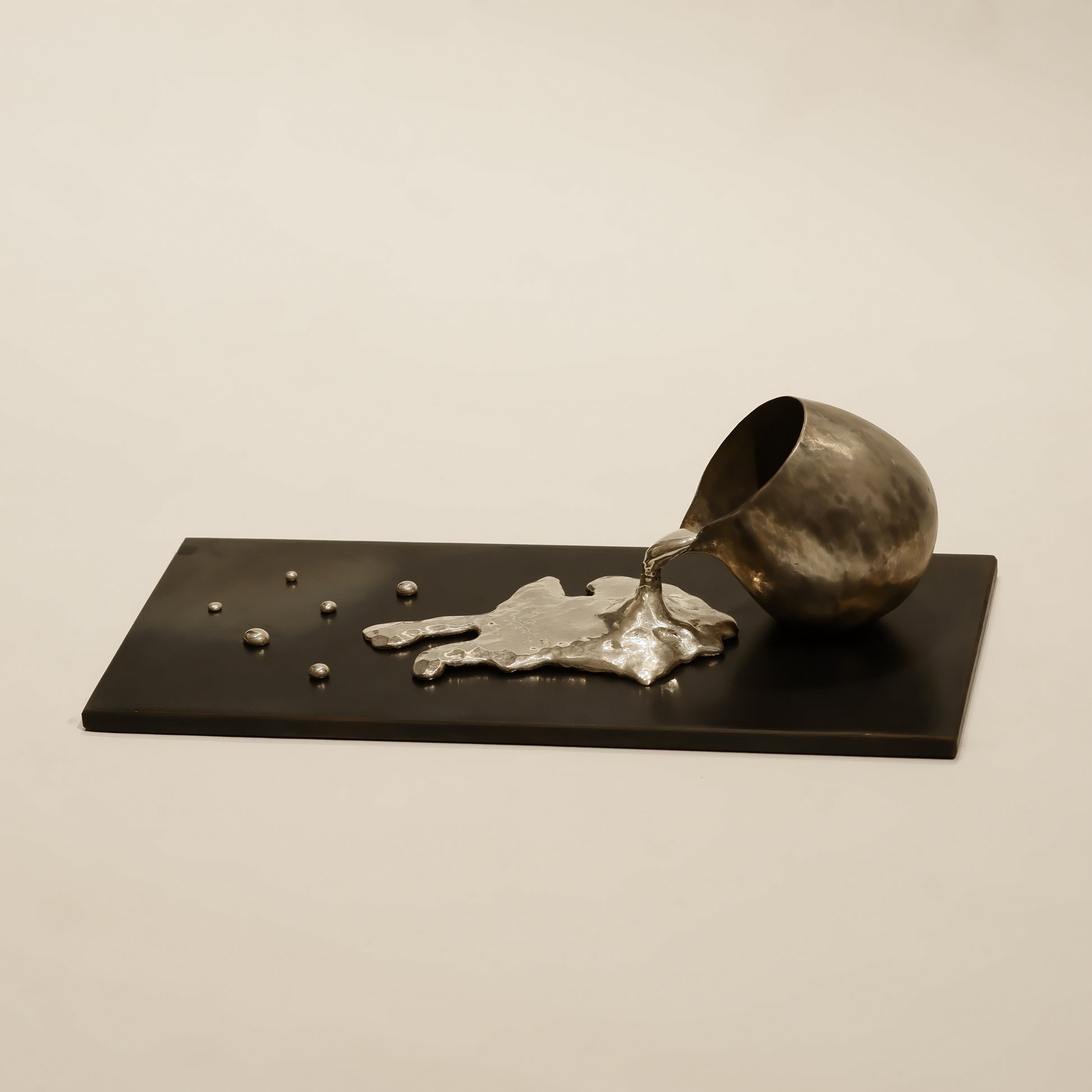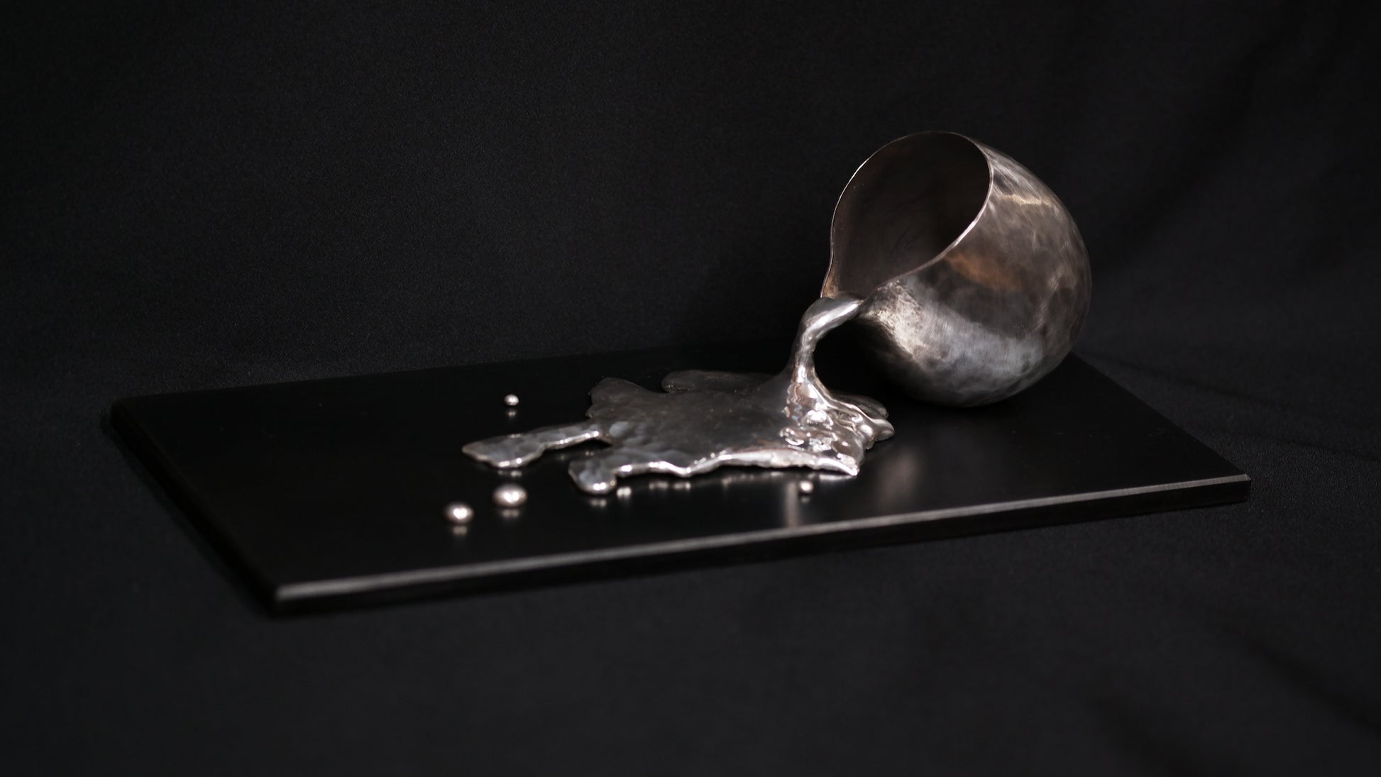 器の中に納まっている純銀の粒が外に出ていくにつれて溶け出すことで進化し、職人の手で叩きあげられることで命を吹き込まれ、形になっていく。